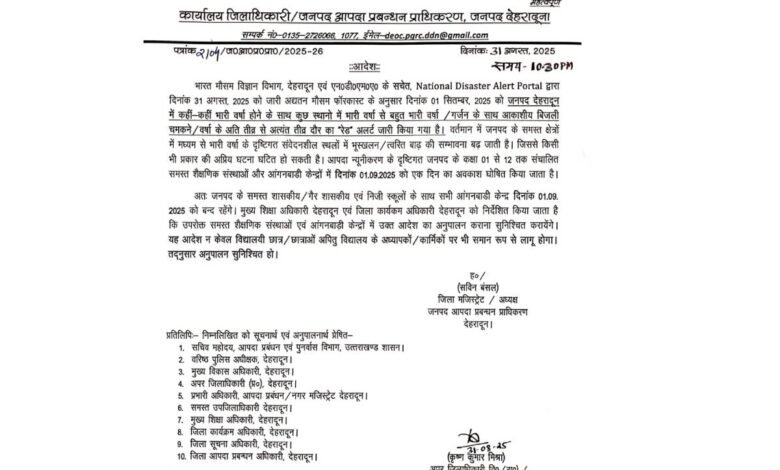 उत्तराखंड में मौसम विभाग की चेतावनी के बाद प्रशासन ने सतर्कता बरतते हुए बड़ा निर्णय लिया है। राज्य के कई जिलों में 1 सितम्बर 2025 (सोमवार) को सभी स्कूलों (कक्षा 1 से 12 तक) और आंगनवाड़ी केंद्रों में अवकाश घोषित कर दिया गया है। यह निर्णय बच्चों की सुरक्षा और संभावित आपदा प्रबंधन को ध्यान में रखते हुए लिया गया है।